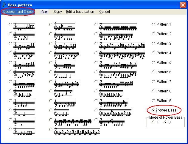 The "Mode of Power Bass" check box on the "Bass pattern" screen is a number of musical interval which a base constitutes.
