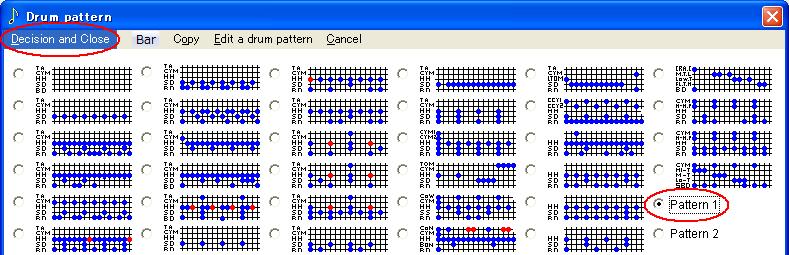 On the "Drum pattern" screen, click "Pattern 1" and click "Decision and Close".