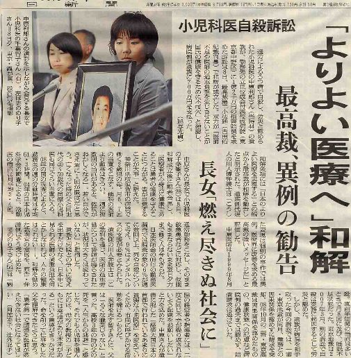過労によるうつ病で自殺し、労災と認められた小児科医の中原利郎さん(当時44)の遺族が、勤務先の立正佼成会付属佼成病院(東京都中野区)に1億2千万円の揖害賠償を求めた訴訟は8日、最高裁第二小法廷(古田佑紀裁判長)で和解が成立した。双方が「医師不足や医師の過重負担を生じさせないことが国民の健康を守るために不可欠」と確認し、病院側が遺族に700万円を支払った。