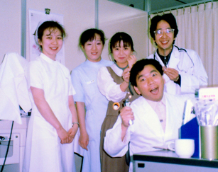 佼成病院に就職したての頃、小児科外来でスタッフと同僚の高瀬先生とカメラを前におどけてみせる中原先生
