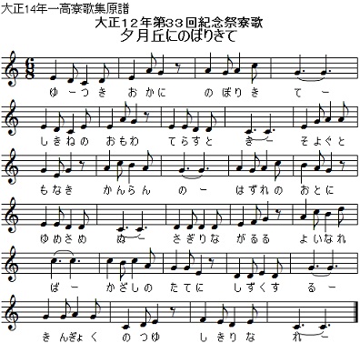 | 井下登喜男先輩 | この寮歌は、各節1回づつ計6回も『丘』という文字を意識的に使用、13回『緑もぞ濃き』、24回『ゆれて漂ふ』を本歌取り。また、この歌の発表後に最初に刊行された寮歌集とその次の版とでは歌詞が違ったものになっている。井上司郎氏に確かめたところ、寮委員に頼まれて出した応募作が自分自身、気に入らなかったので、後日、全面的に書き改めたような気がするという話があった。 | 「一高寮歌メモ」から |