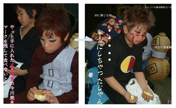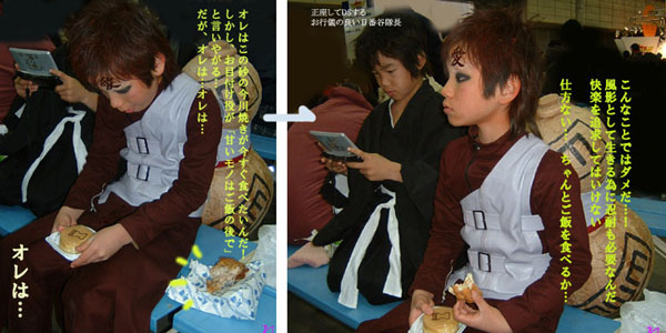 【我愛羅の苦悩】 我愛羅クンは悩んでいた 砂の今川焼きを手に、1分間以上も固まっていた 脇には、食べかけの昼食が残されていた お目付け役として残されていた カリス☆ままんが言った 「ちゃんとお昼御飯食べてからじゃないと、甘いモノ食べちゃダメだよ」 我愛羅クンは動かなかった さらに1分間、黙って今川焼きを見つめていた 数分間の沈黙の後、やっと食べかけの肉を手に取り、口にした。 やった! 我愛羅クンは、自分の欲望に打ち勝つことができたのだ! レポーターの私は、ここまでしか見ていなかったが 隣に座っていたテマ姉は、その後衝撃のシーンを見ることになる…! (続く……なんちて画像ないから続きません) |