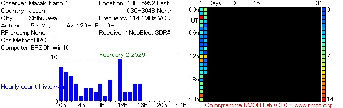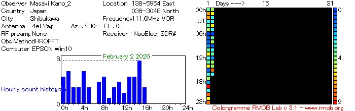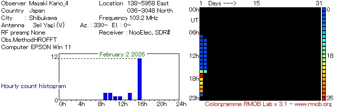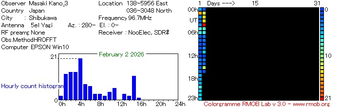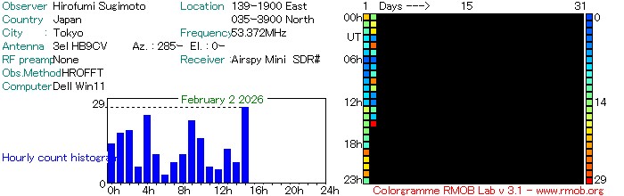 アマチュア無線のビーコンを受信する方法(HRO)とVORの電波を受信する方法に加えて、FM放送の電波を受信する方法(FRO)の3種類で電波観測ライブをしています。画像は、自動カウントしたのを1時間毎にグラフ化をしています。ロングエコーや雑音の影響により手動でカウントしたよりもやや多めとなります。