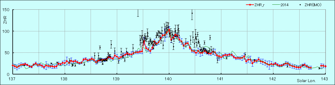 ・眼視観測(ZHR)は、内山茂男氏のホームページと日本流星研究会のホーページに掲載されている速報集計結果を使用しています。