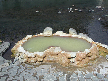 ■ 川原にあるガニ湯は無料で入れる露天風呂です。 丸見えなのでさすがに昼間は誰も入っていません。 でも暗くなってからは利用する人もいるようです。 炭酸がシュワシュワと泡になって漂う様子はなるほど カニみたい。いやカニではなく「ガニ」なんだそうで。 |