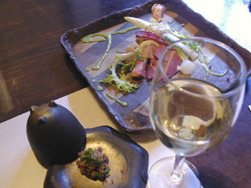 ■ 宿特製のハムやエノハ(ヤマメ)料理が楽しめる 和洋折衷の夕食です。すべて呂人窯の洒落た器で。 黒っぽい器は料理を引き立てます。