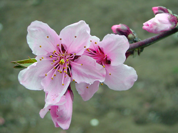 ■ 天気が悪かったので眺めはイマイチでした。 桃は蕾も多く見頃には早かったのですがこんなふうに 開花している枝もありました。 |