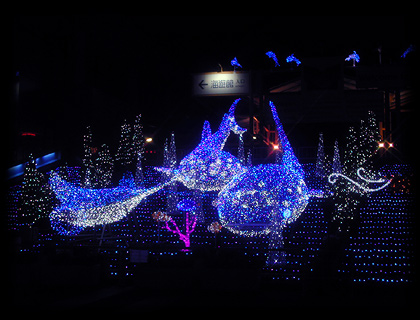 人気者のジンベエザメやイトマキエイなどがモチーフのイルミネーション、