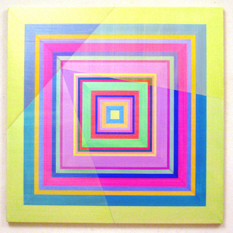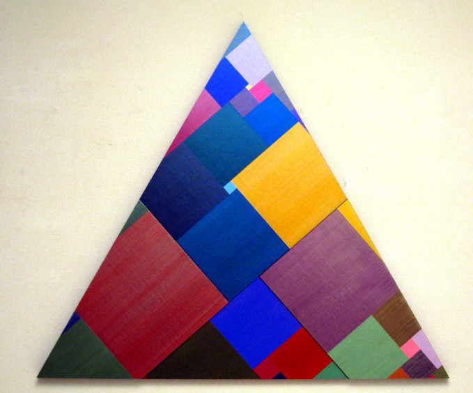 Joy Division of the altered twenty-one different coloured squares on the square ground tranaformed into the triangle frame consists of four other veiled colour fields combined one right triangle with three quadrangles