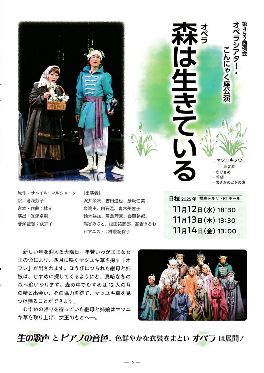 あらすじ 新しい年を迎える大晦日、年若くわがままな女王が、4月に咲くマツユキ草がほしいと言い出したため、国中が大騒ぎ。 ほうびの金貨に目がくらんだ、継母と姉娘のいいつけで、マツユキ草を採ってくるようにと一人の娘が真っ暗な森に追いやられます。 森に出かけた娘は、そこで一月から十二月までの月の精たちに出会います。 娘の話を聞いた四月の精は、他の月たちに頼んで一時間だけ「時」を譲ってもらいます。冬の森はたちまち春へと季節を変え、むすめの目の前で一面にマツユキ草が顔を出します。 むすめの帰りを待ちかまえていた継母と姉娘はマツユキ草を取り上げ、宮殿の女王の元へ。 女王は、みずからマツユキ草を摘むために家来たちを引き連れて森へ出かけていきます。しかし、そこで待ち受けていたものは……。 解説 オペラ「森は生きている」は1992年の初演以来、毎年上演を重ねているこんにゃく座の代表的なレパー^トリーの一つです。これまでに1992年岡村晴彦、2005年高瀬久雄(文学座)、2012年大石哲史(こんにゃく座)、2021年眞鍋卓嗣(劇団俳優座)が演出を手がけています。 ロシアの民話を元にサムイル・マルシャークがこの物語を書き上げたのは今から約80年前のことです。当時の時代背景も影響し、マルシャークは子どもたちのために児童文学の執筆に力を入れていました。(マルシャークは戦争で犠牲になった子どもたちを救援する仕事に、ある時期関わっていました。) ファンタジーでありながら自然や人間の本質を描いたこの物語は、林光作曲の生き生きとした音楽と結びつき、子供から大人まで多くの人を魅了してきました。 演出の真鍋氏は作品の本質に立ち返り、自然の理と対峙する登場人物の姿を通して、新たな角度で「今」を照射するオペラへと仕上げました。 歌役者による生の歌声とピアノの音色、色鮮やかな衣装、美しい舞台セットと照明効果によって、観ている人たちを一瞬にして物語の世界へ誘います。 オペラ「森は生きている」は時代を経ても色褪せない、舞台作品の醍醐味に溢れています。 |