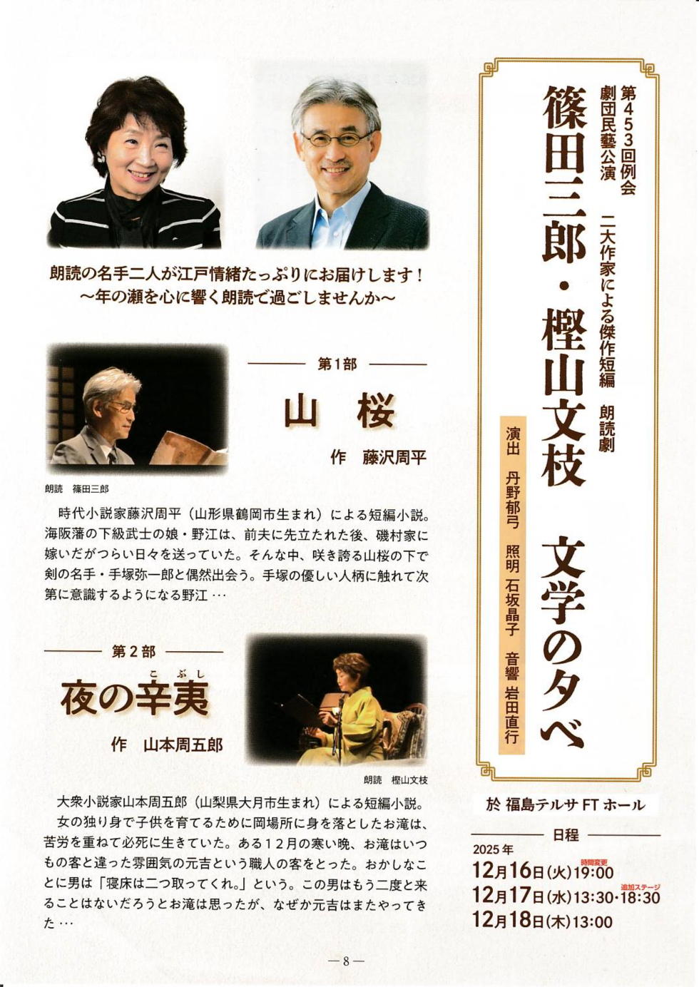 第453回12月例会 劇団民藝公演 「篠田三郎・樫山文枝 文学の夕べ」