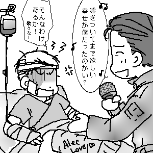 お題その8.包帯 「ゴールデンアイ」後。 ボンド君が歌ってるのはご存知、マッキーの「SPY」です。 あらためて聞いてみると、 もう76のテーマソングといってもいいくらい(笑) あ、ちなみに足のギプスに書いてあるのは ボンド君による落書きですよ。 定番定番v