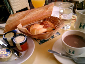 ホントはgucci、甘くないカフェオレが好きなんだけど、寒いし、なんとなく、パリジェンヌっぽいかな、と思ってショコラショー(ホットココア)とプティデジュネ(朝食)を頼んでみる。