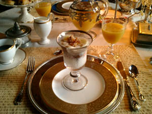 昨日のテーブルに、朝食のセッティングがしてあり、オーナー夫人自ら、パンのカゴやヨーグルト、コーヒーやミルクを持ってきてくれる。