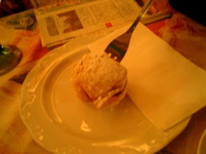 ニュルンベルクソーセージとアップルパイ、ローテンブルク名物「シュネーバル(スノーボール)」を注文した。