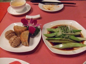 となりにあるのはデザートの月餅と、胡桃をかたどった、さくさくした焼き菓子。おいしいけど、腹持ちがよすぎるのが難。