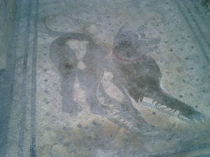家々の床に残るモザイク画(モザイク画でその家が作られた年代がわかるんだって。最初はシンプルな幾何学模様だけだったものが、のちに絵と変わらないほど細かなものになる)、