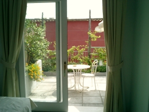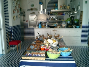 パラソルの下に、いくつかテーブルが並んでいて、ロビーの隣の朝食ルームに、パンやケーキ、コーヒー、果物が並んでいる。