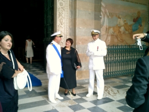 (しかし帰国後の調べで、これは普通の結婚式であったことが判明。イタリアでは宗派によってはバージンロードが青というところも多く、南イタリアでは海軍に勤めている男性も多くて、その場合は新郎はタキシードの変わりに軍服を着るらしい。隣に立ってた同じ服装の男性は、新郎のベストマン、つまり介添え人だったってことなのね…。なーんだ、つまーんなーい。)