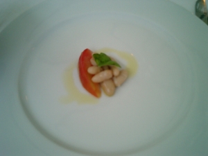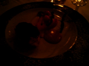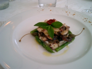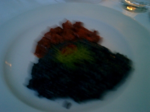 ワインを飲みながらメニューを検討し、前菜にトラウトとトマトの温かいカルパッチョ、メインにイカ墨のリゾットを頼む。