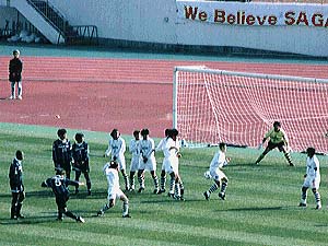 前半7分、松波が強烈ヘッディングシュートを放つが、サガン選手がゴール内ライン上で体を張って食い止める。さらに跳ね返ったところさらにシュートするがゴールポストに弾かれる。