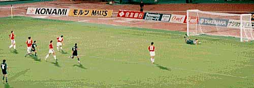 37分、ルイジーニョから播戸が林を抜き去り今度は一人で持ち込みシュート、ゴール上へ。