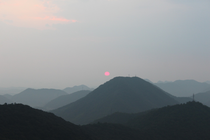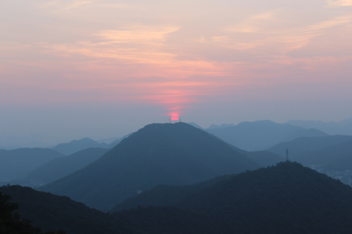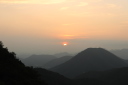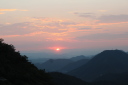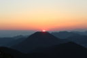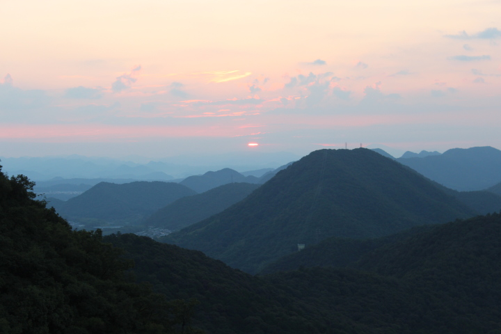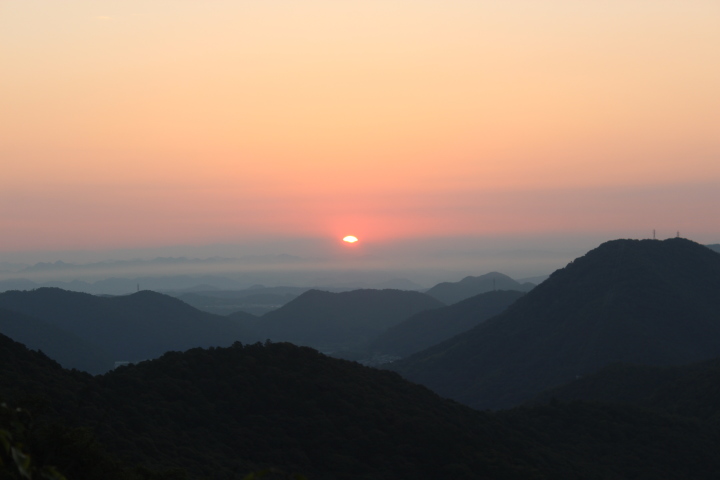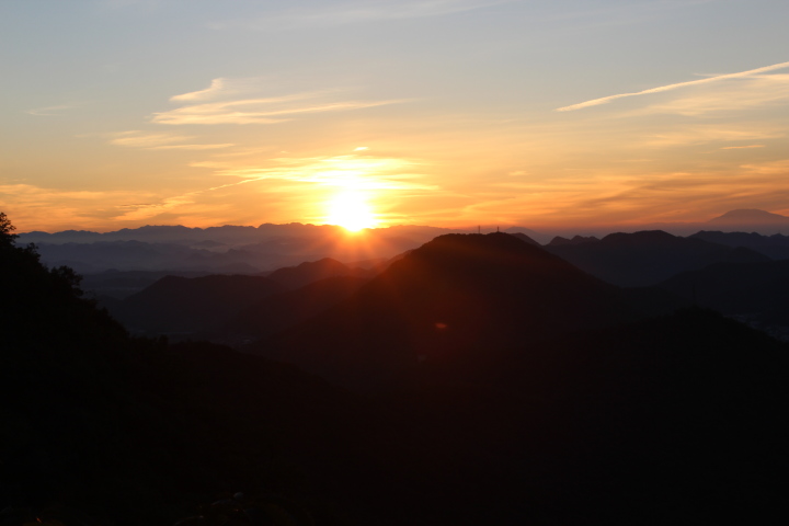 | 今朝(R7/8/30)の金華山上空は晴れ、頂上の温度計は27℃を指していました。日の出は少しガスのかかった山の稜線からでした。 | |