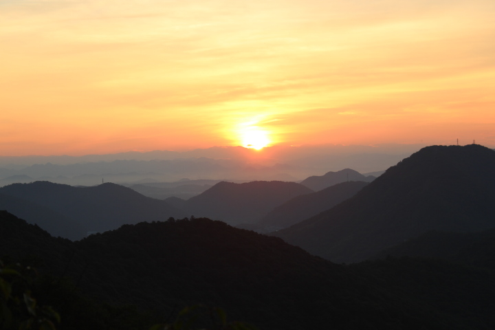 | 今朝(R7/8/2)の金華山上空は晴れ、頂上の温度計はこの夏最高の27℃を指していました。しかし、頂上には風があり少し癒されました。日の出は少し雲のかかった山の稜線からでした。 | |