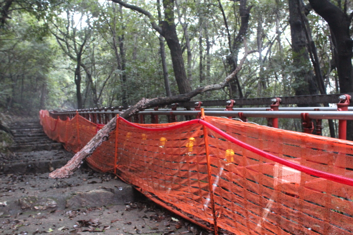 | 今朝(R7/8/12)の金華山上空は曇り空、頂上の温度計は25.5℃を指していました。日の出は望めそうにありませんでしたので七曲りを経由して下山しました。下山途中に工事用のモノレールの上に直径15Cm程の枯れ木が落ちていました。 | |