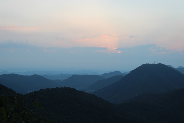 | 今朝(R7/8/16)の金華山上空は晴れ、頂上の温度計は26℃を指していました。日の出は山の稜線にかかった雲が高くまであり時間がかかりそうでしたので諦めて下山しました。 | |