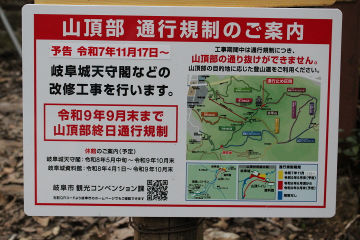 | 今朝(R7/8/23)の金華山上空は曇り空、頂上の温度計は26℃を指していました。日の出は山の稜線のようでしたがすぐに上の雲の中に隠れてしましました。 お城の修理に伴う山頂部通行規制(山頂部の通り抜けができません、目的地にあった登山道を利用してください。期間:令和7年11月17日から令和9年9月末まで(予定))の上の通り抜け禁止の予告が出ていました。 |