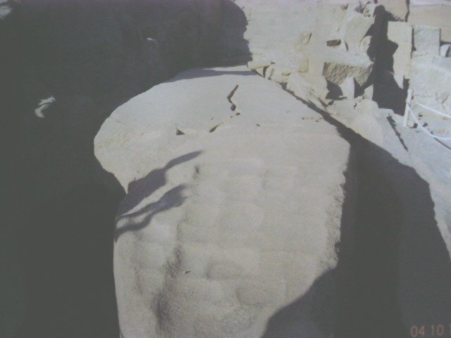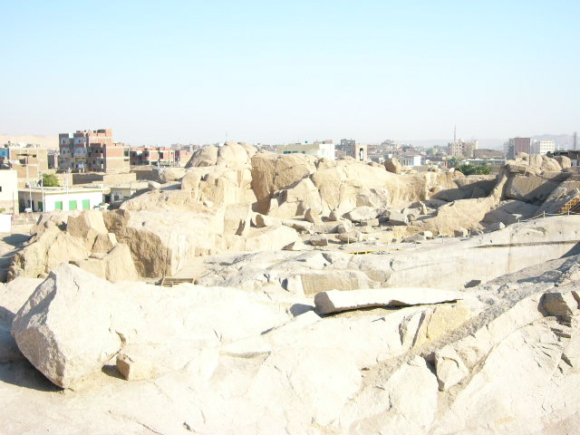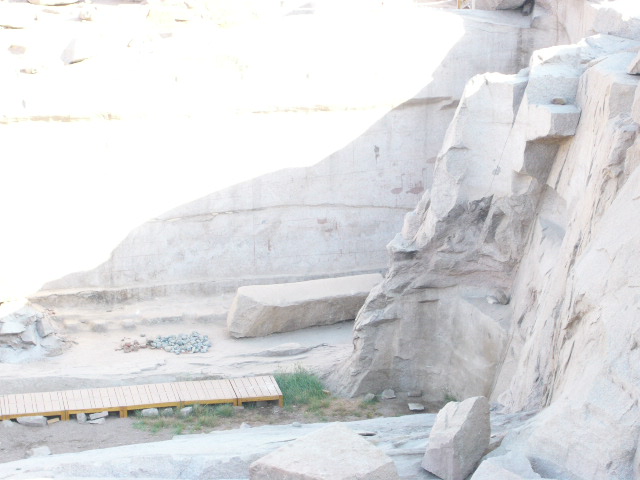 | 町外れの古代の石切り場跡に、もし完成していたらエジプト最大と言われる、長さ約42メートルの切りかけの赤色花崗岩オベリスクがある。 岩に亀裂が入り、切り出しは中止された。 岩に当時の落書きが残る。 |