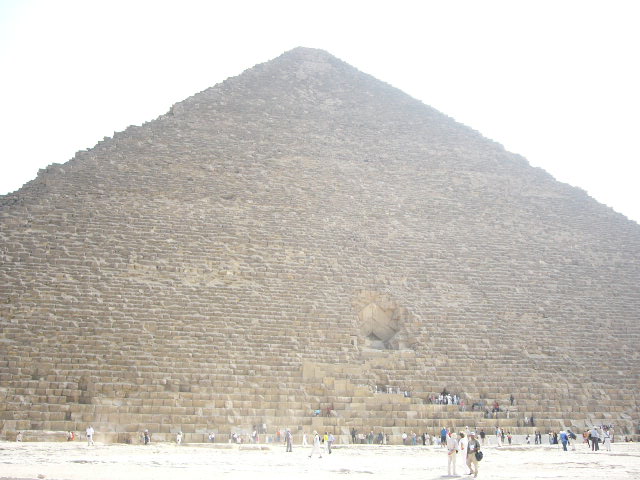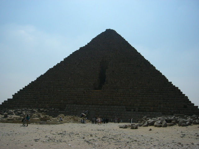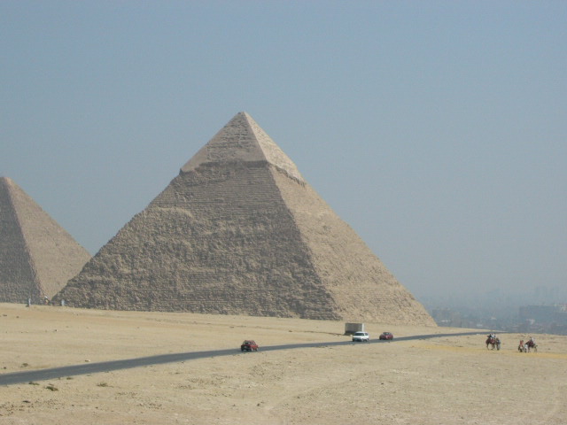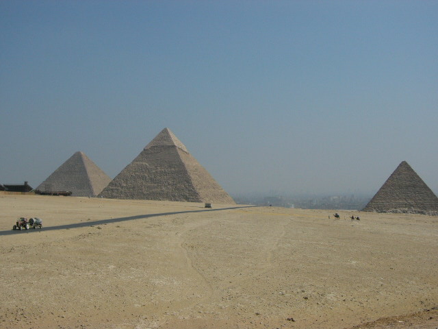 | クフ王のピラミッドと呼ばれている第1ピラミッドは、1個あたり平均2.5トンの石灰岩のブロックが230万個使われていると計算される。 写真下左:第2ピラミッド(カフラー王のピラミッド) 写真下中:第3ピラミッド(メンカウラー王のピラミッド) 第1ピラミッドの上昇通路は中腰で歩き、人とすれ違うのがやっとの70センチの幅。観光客の息と熱気と換気の悪さで蒸し暑い。 |