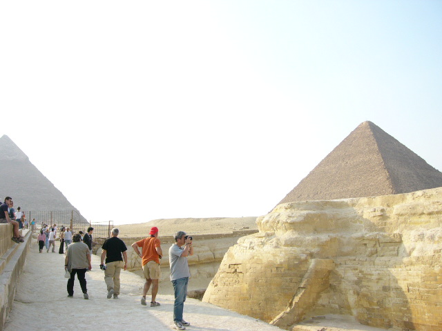 | 第2ピラミッドの参道に人面(カフラー王?)獣身のスフィンクスがある。一枚岩の石灰岩で出来ており、全長57メートル、高さ20メートル。 K.F.Cを眺めているのを確認。 写真右:スフィンクスの尻尾 |