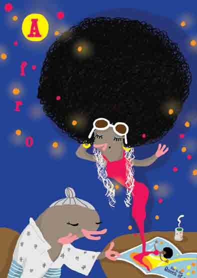 アフロ。丸く もじゃもじゃに 盛り上げた ヘアスタイル。