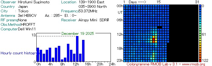 アマチュア無線のビーコンを受信する方法(HRO)とVORの電波を受信する方法に加えて、FM放送の電波を受信する方法(FRO)の3種類で電波観測ライブをしています。画像は、自動カウントしたのを1時間毎にグラフ化をしています。ロングエコーや雑音の影響により手動でカウントしたよりもやや多めとなります。