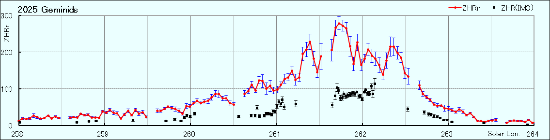 ・眼視観測(ZHR)は、内山茂男氏のホームページと日本流星研究会のホーページに掲載されている速報集計結果を使用しています。