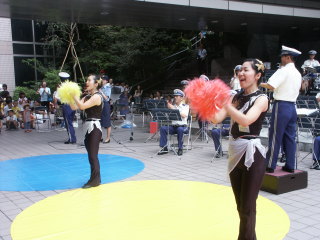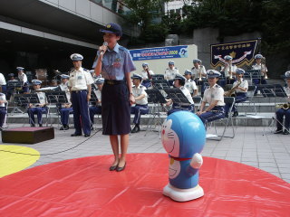 | コンサートにはドラえもんも駆けつけてくれました | 子どもたちと演奏する女性隊員 | カラーガード隊員の演技 |