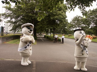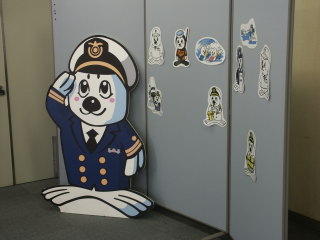 海上保安試験研究センターでお出迎えのうみまる君とうーみん |