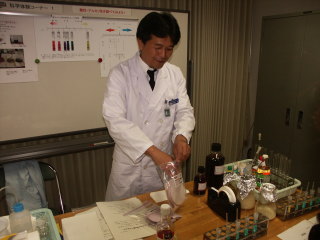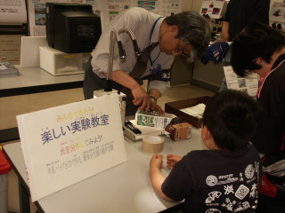 科学体験コーナー1酸性・アルカリ性を調べようのコーナー白衣を着ている方は海上保安官です。 リトマス試験紙を用いての実演が行われました。 |