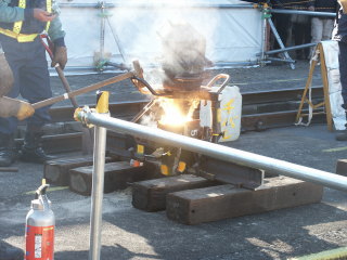 レール切断の様子です。 ガスによる切断の様子です。 |