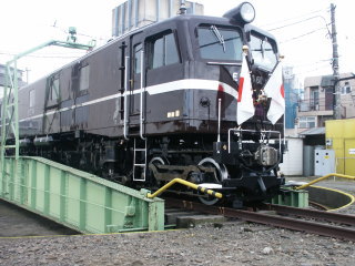 EF58 61号機 ロイヤルエンジンと呼ばれたお召し列車専用機。 非常にきれいな状態で現在も運用されています。 当日は転車台展示されていました。 |