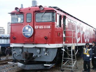 EF65 1118号機 直流型電気機関車。「スーパーエクスプレスレインボー」の専用機として塗色変更されましたが、現在「スーパーエクスプレスレインボー」は廃止されたもののこの塗色で運用されています。 現在、EF65型機関車は各地で活躍しています。 |