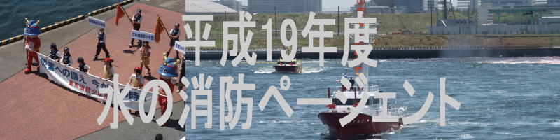 | 平成19年5月20日 東京港晴海埠頭にて消防職員234名、消防艇9艇、ヘリコプター3機が参加して「水の消防ページェント」が行われました。 当日は東京消防庁の臨港消防署、高輪消防署、日本橋消防署に所属する全消防艇が参加し分列行進や航行放水、消火演技やカラー放水が行われた他に東京消防庁音楽隊ならびにカラーガード隊と消防少年団によるパレードも行われました。 |