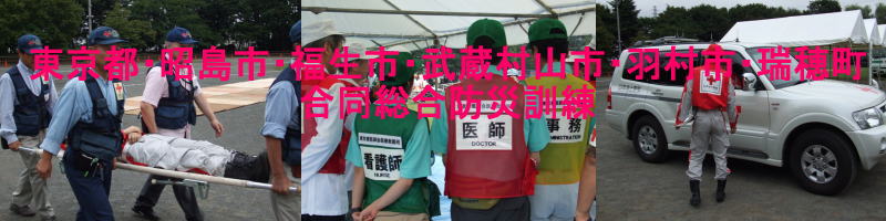 | 平成19年9月1日 東京都・昭島市・福生市・武蔵村山市・羽村市・瑞穂町合同総合防災訓練が東京消防庁、警視庁、陸上自衛隊、日本赤十字社東京都支部などの関連機関が参加して実施されました。 羽村市の富士見公園では軽傷者応急手当訓練、傷病者担架搬送訓練、三角巾指導訓練が行われ、日本赤十字社東京都支部災害救護ボランティアが活動しました。 |