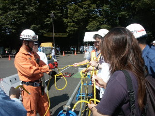 ロープワーク体験コーナー特別救助隊員さんの"もやい結び"の素早さには感動しました。 |