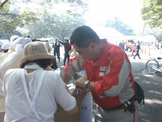 非常食配食訓練Bアルファ米の調理中です。画像の赤×グレーの服を着ているのは日赤東京都支部の職員の方です。 ちなみにこれは日本赤十字社の新型救護服です。 |