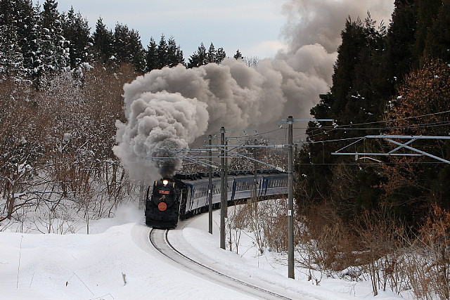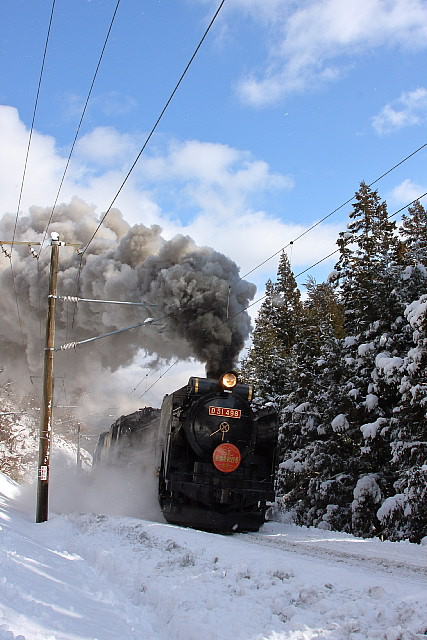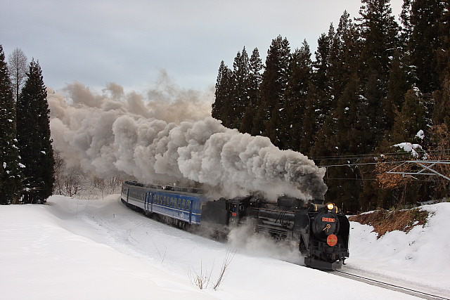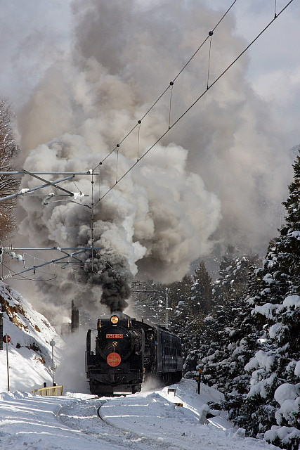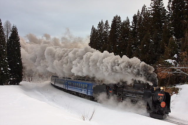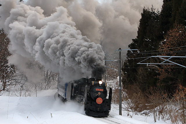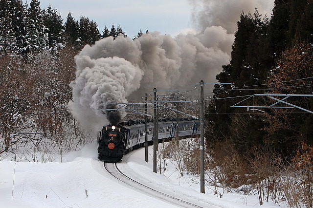 | 真冬の磐越西線(郡山〜会津若松)をD51(デコイチ)が「SL会津冬紀行号」として2年ぶりに運行されました。運行日の3日間ともほぼ天候に恵まれ初日9日の夜はかなりの降雪がありさらに雪景色を演出してくれました。人気の撮影場所は多くのの撮影者で大変な賑わいでした。雪の中を爆煙で走り抜ける「SL会津冬紀行号」(D51-498号機)は本当に迫力がありました。来年も是非運行することを期待したいです。 |