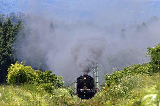 ◇阿賀野川深戸橋梁を渡った「SLばんえつ物語」は 平瀬トンネルに向かう夏草茂る築堤を陽炎に揺れながら煙を上げて正面から迫ってきます。 迫力の通過を正面アウトからの撮影でした。 |