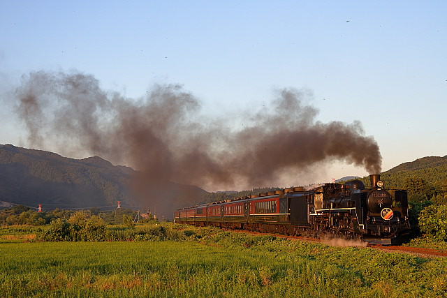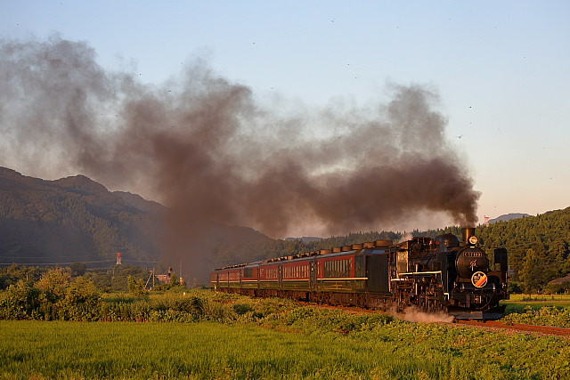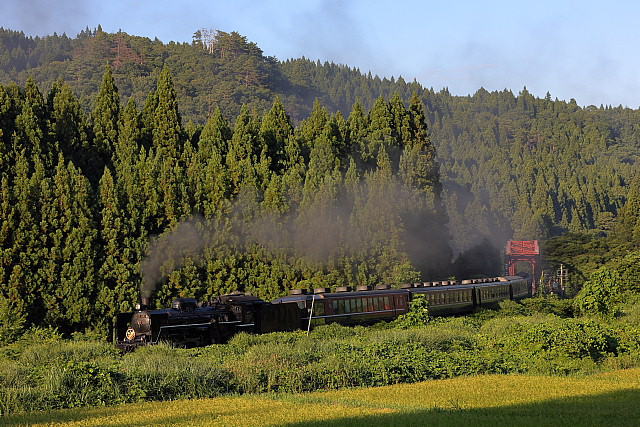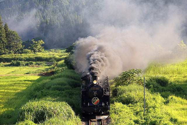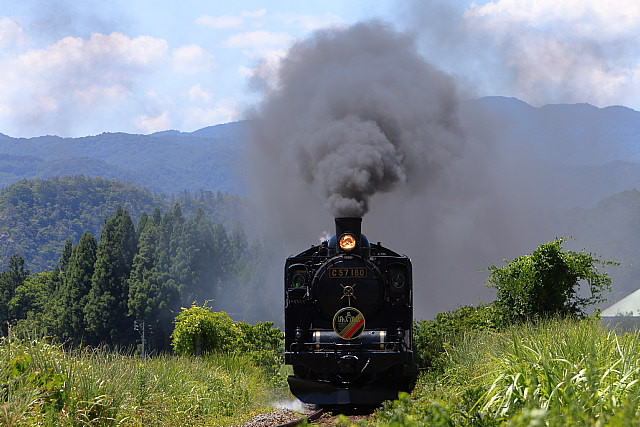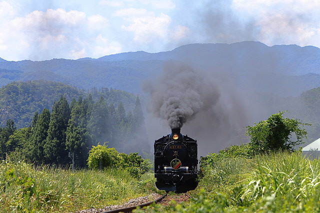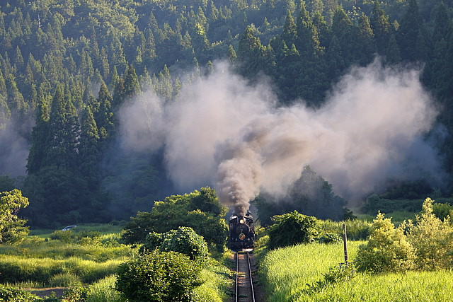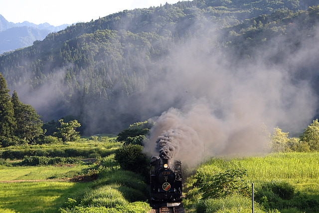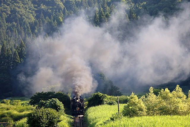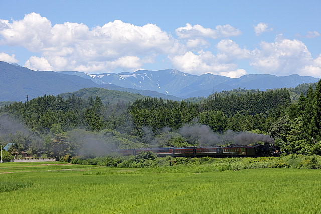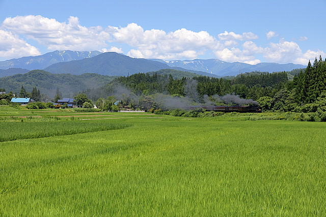夏の磐越西線に「SLばんえつ物語」の撮影に2日間出掛けて来ました。2日間ともほぼ晴天に恵まれ青空に白い雲浮かぶ夏風景が広がっていましたが、沿線は両日共に猛暑日となり初日の阿賀町、津川町では観測史上最高気温を更新する39℃を記録するなど猛暑の中での撮影となりました。今回は夏らしい風景の中を走る「SLばんえつ物語」を主題にして撮影してみました。 |